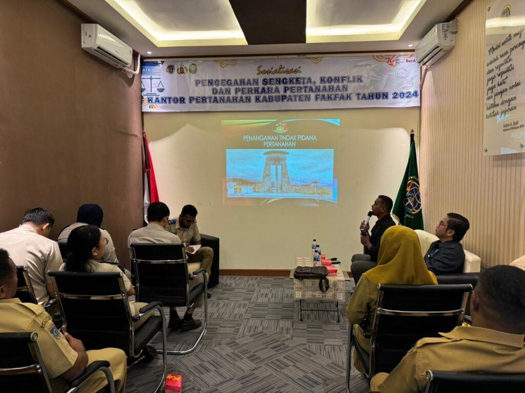 Fakfak-tajukterkini.com-Kepolisian Resor Fakfak melalui Satuan Reserse Kriminal melaksanakan kegiatan sosialisasi tentang sengketa pertanahan. Kegiatan yang dipimpin oleh Kepala Satuan Reserse Kriminal (Kasat Reskrim) Polres Fakfak, AKP Arif Usman Rumra, S.Sos., MH, berlangsung di Aula Kantor Pertanahan jalan Ahmad Yani pada Senin (30/7/2024).