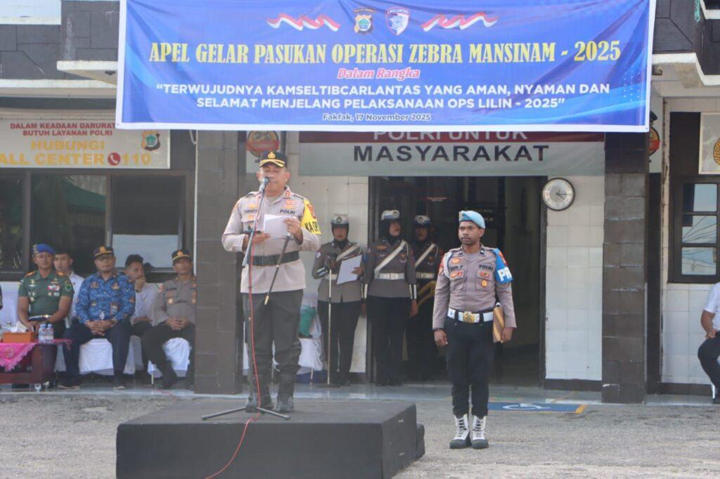 Fakfak – Polres Fakfak menggelar Apel Gelar Pasukan Operasi Zebra Mansinam 2025 dalam rangka menciptakan keamanan, keselamatan, ketertiban dan kelancaran lalu lintas (Kamseltibcarlantas) menjelang pelaksanaan Operasi Lilin 2025, Rabu (17/11) di halaman Mapolres Fakfak, Jalan Thumburini No.1.
