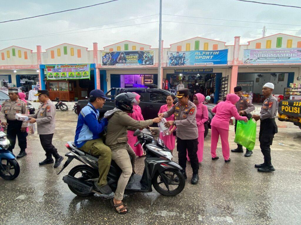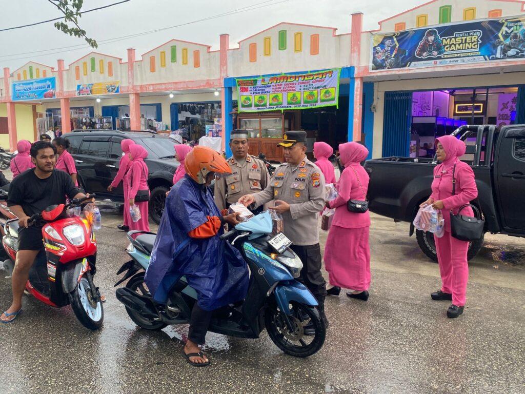 Dalam kegiatan tersebut, personel Sat Samapta bersama Bhayangkari turun langsung ke jalan membagikan paket takjil kepada masyarakat serta pengendara yang melintas menjelang waktu berbuka puasa.