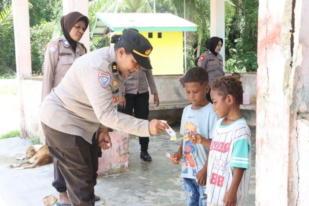Selain berbagi, para Polwan juga berinteraksi langsung dengan anak-anak melalui kegiatan bermain bersama serta memberikan edukasi mengenai pentingnya menjaga kebersihan diri sejak usia dini. Anak-anak diajarkan cara menyikat gigi yang benar serta diingatkan untuk selalu menjaga kebersihan tubuh dengan mandi minimal dua kali sehari agar tetap sehat dan terhindar dari penyakit.