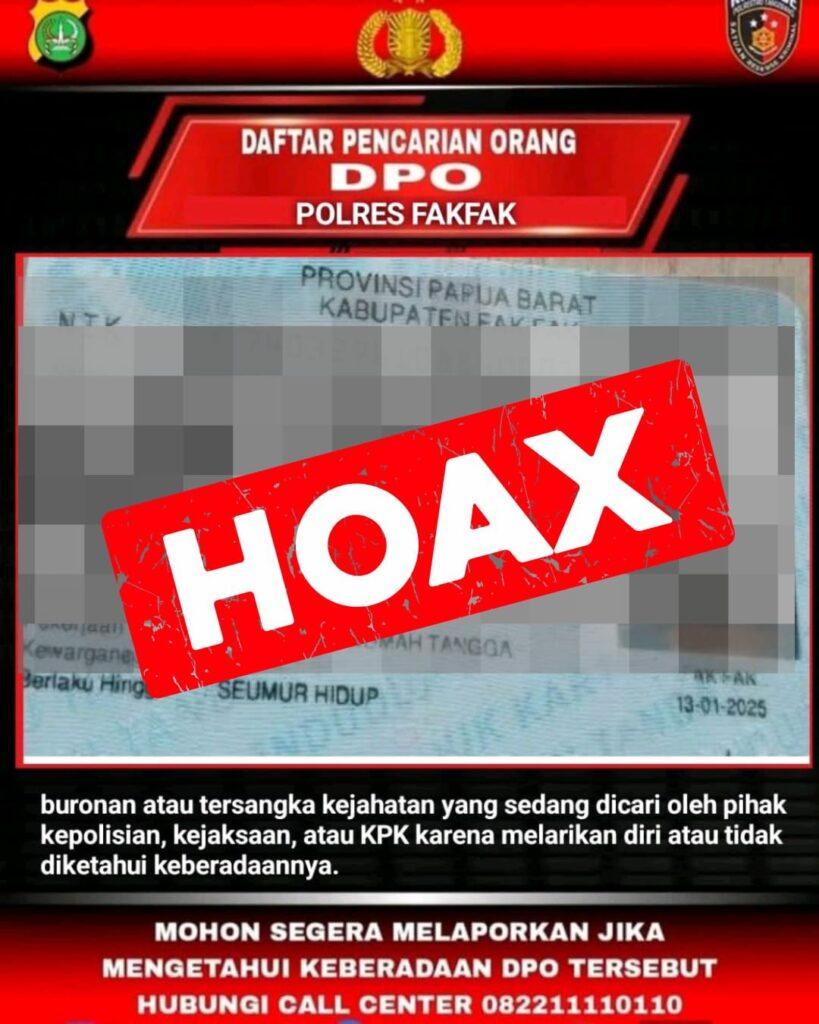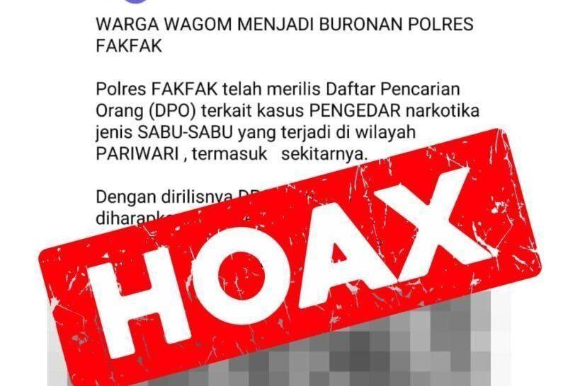 Fakfak – Terkait beredarnya informasi di media sosial mengenai Daftar Pencarian Orang (DPO) kasus narkotika jenis sabu-sabu di wilayah Wagom, Distrik Pariwari, dengan ini disampaikan bahwa informasi tersebut adalah tidak benar (HOAX). Senin (6/4/2026).